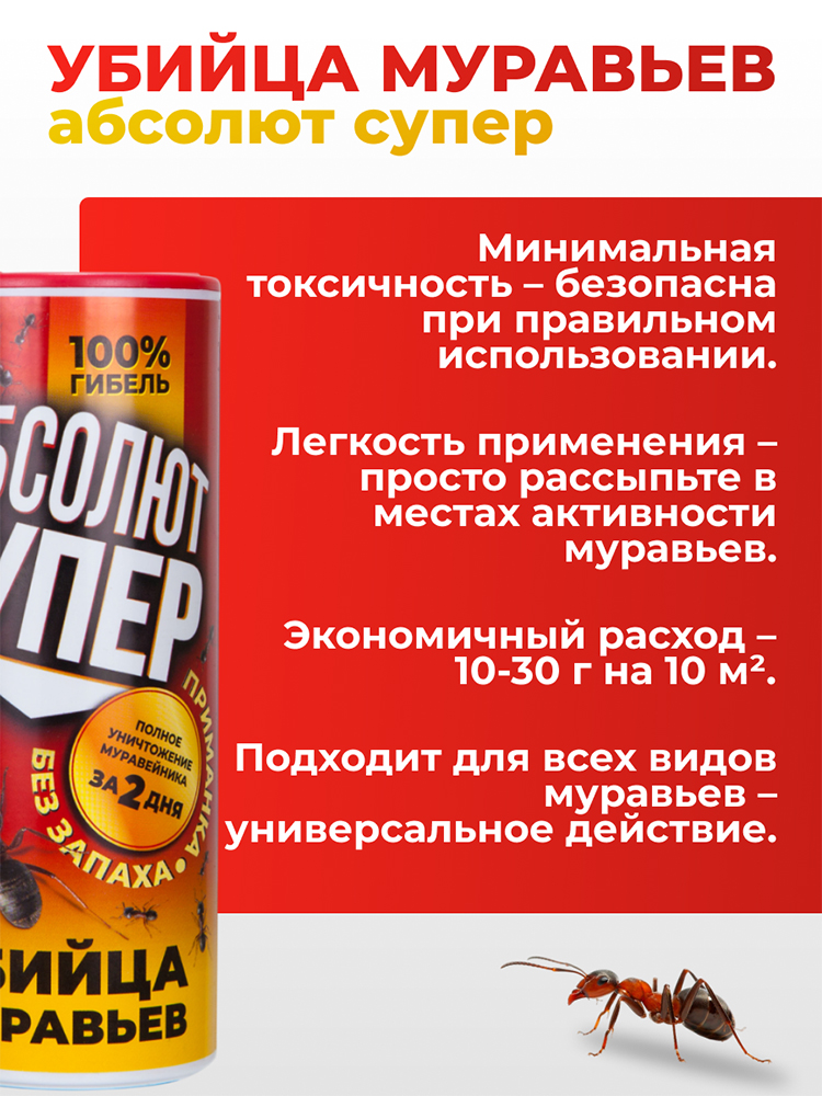 Абсолют супер – универсальное средство для борьбы с насекомыми в доме, квартире или на даче. Приманка для вредителей объемом 2000 г обладает сильным эффектом против муравьев. Средство отрава подходит для обработки комнат, кухни, ванной, туалета и погреба.